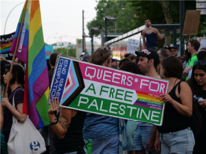 Όχι όμως την κλασική που έφερε απλώς οριζόντιες ρίγες στα χρώματα του ουράνιου τόξου. Μία νεότερη εκδοχή της, η οποία στην αριστερή πλευρά φέρει και ένα τρίγωνο το οποίο συμβολίζει τους «εγχρώμους» [people of color]. H σημαία αυτή, μάλιστα, ή διάφορες παραλλαγές της, τον τελευταίο χρόνο έχει χρησιμοποιηθεί σε διαδηλώσεις για να εκφράσει συμπαράσταση προς την Παλαιστίνη[1].