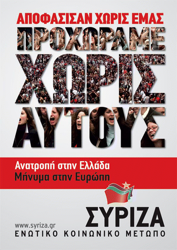 This pattern, however, is not that evident as regards the phrase on poster no 2, which, as the authors themselves note, served as “SYRIZA’s main slogan for the campaign of the May 2012 elections”. This phrase reads: “They decided without us, we’re moving on without them”.
