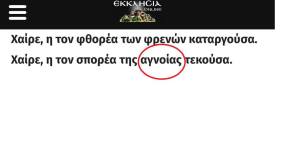 H φράση την οποία παραθέτει η «επιγραμμική εκκλησία» από τους Χαιρετισμούς χαιρετίζει την παρθένο Μαρία καθότι έτεκε τον σπορέα της αγνείας (= της αγνότητας). Οι συντάκτες, όμως, (ή ο αυτόματος διορθωτής του επεξεργαστή τους), φαίνεται ότι δεν αναγνώρισαν τη λέξη αυτή γραμμένη με ε ως υπαρκτή ελληνική λέξη και την αντικατέστησαν κατά τρόπο που να δείχνει ότι οι Χριστιανοί λατρεύουν τον ιδρυτή της θρησκείας τους ως σπορέα της άγνοιας, και είναι πολύ ευχαριστημένοι και υπερήφανοι γι’ αυτό.