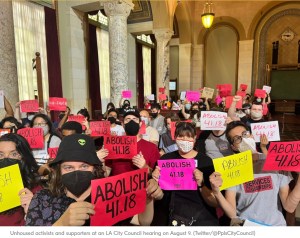Ο δήμος αδυνατεί επίσης να φροντίσει τους αστέγους. Έχουμε πάνω από 70.000 δημότες που ζουν στους δρόμους ή στα αυτοκίνητα και τα τροχόσπιτά τους ή κοιμούνται στον καναπέ κάποιου γείτονα. Δεν μπορούμε καν να συλλάβουμε την κλίμακα του φαινομένου. Κι ωστόσο ο δήμος εφαρμόζει ανελέητα αυτό το δημοτικό διάταγμα που έγινε γνωστό ως 41.18, το οποίο ουσιαστικά ποινικοποιεί όσους κοιμούνται στους δρόμους. Ως αποτέλεσμα, χιλιάδες άνθρωποι έχουν εκδιωχθεί από τα σπίτια και τις κοινότητές τους. Ο δήμος μόλις δημοσίευσε μια έκθεση που εξετάζει τον αντίκτυπο της επιβολής του 41.18: βρήκαν ότι δόθηκαν 3 εκατομμύρια δολάρια από τον δήμο και, από όλα τα άτομα που επλήγησαν, στεγάστηκαν μόνιμα δύο μόνο άτομα! Υπάρχει λοιπόν μια κρίση στην πόλη μας, ειδικά όσον αφορά την ικανότητά μας να καλύπτουμε τις βασικές μας ανάγκες. Το Λος Άντζελες, από αυτή την άποψη, είναι το πιο κατάλληλο μέρος για να ξεκινήσει αυτό το κίνημα.