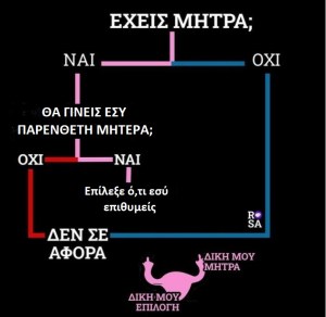 Προ καιρού, αρκετές φεμινίστριες, οι οποίες δεν ανήκουν στο ΛΟΑΤΚΙ+ κίνημα, αντιθέτως είναι μάλλον αρνητικές απέναντί του, είχαν κυκλοφορήσει μια αφίσα υπέρ του δικαιώματος στην έκτρωση. Η αφίσα βασιζόταν στο σκεπτικό ότι αρμόδια να αποφασίζει για την πραγματοποίηση ή μη έκτρωσης είναι όποια έχει μήτρα, και μάλιστα όχι οποιαδήποτε μήτρα αλλά εκείνη όπου βρίσκεται το προς αφαίρεση έμβρυο.